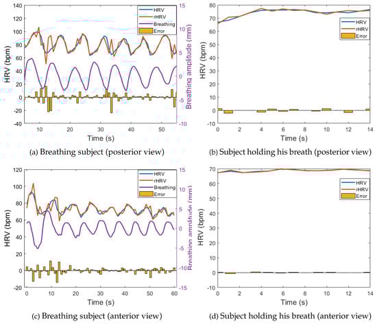 Results obtained with a posterior view are illustrated in Figure 16a, where the HRV and rHRV sequences are depicted along with the error taking HRV as a reference. The breathing has been represented so as to show the RSA effect, where the breathing amplitude affects the heart rate. Moreover, it is observed that the same correlation between the HRV and the breathing signal obtained by H. Kobatashi is reproduced in Figure 16a. On the other hand, the same experiment has been carried out to confirm that in an apnea scenario the heart rate is almost stable, since it is not affected by breathing. These results can be observed in Figure 16b.