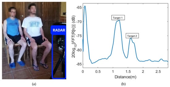 In this section, an experiment is performed to prove the system capability to measure the vital signs of multiple targets at the same time. Thus, the scenario consists of measuring two males of 21 and 25 years, sitting in front of the radar setup, at 1.2 and 1.6 m (Figure 17a), and Figure 17b shows that these two persons can be clearly separated in the frequency domain.
