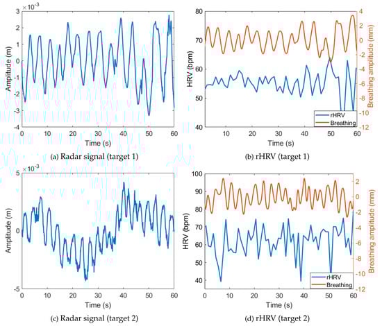 (a) Radar signal obtained from target 1 after performing the pre-processing algorithm. (b) rHRV extracted from the target located at 1.2 m. (c) Radar signal obtained from target 2 after the pre-processing algorithm. (d) rHRV extracted from the target which is located at 1.6 m.