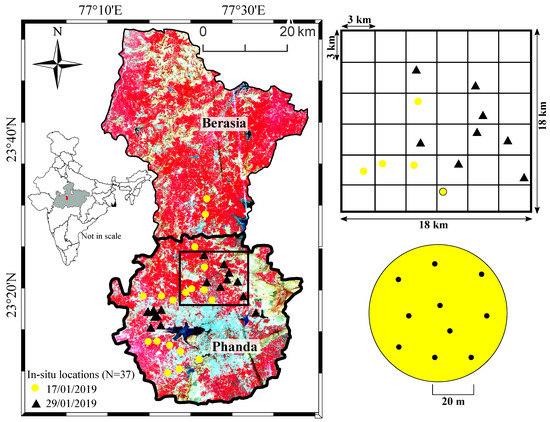Landsat-8 image in False Color Composite (FCC) shows the administrative blocks (Phanda and Berasia) of Bhopal district, Madhya Pradesh. Circles in Yellow and triangles in black are the locations of soil moisture measurement in the field. Grid on the top right illustrates the random sampling strategy to collect soil moisture.