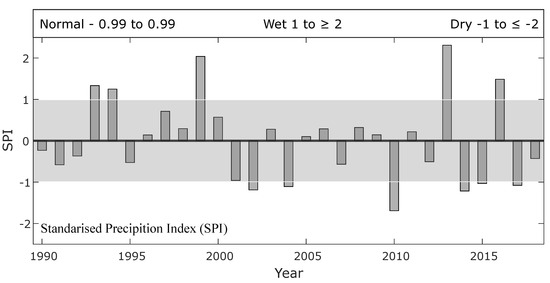 In recent years, the frequency of droughts in central India has increased, which has adversely impacted the agricultural productivity [47]. To obtain the frequency of drought events in the study area, we have calculated Standardized Precipitation Index (SPI) for the monsoon period (JJAS) from 1990 to 2018 using gridded () rainfall data obtained from the Indian Meteorological Department [48,49]. SPI is used to characterise meteorological drought. For example, SPI values in a range between (−0.99 to 0.99) is considered normal, whereas SPI values less than −1 and greater than 1 are considered to be dry and wet period respectively [50]. The SPI values of Phanda block (Figure 2), clearly suggests that the frequency of drought events has increased in last two decades. In total, six drought events (2002, 2004, 2010, 2014, 2015, and 2017) have occurred between the years 2000 to 2018 (Figure 2).