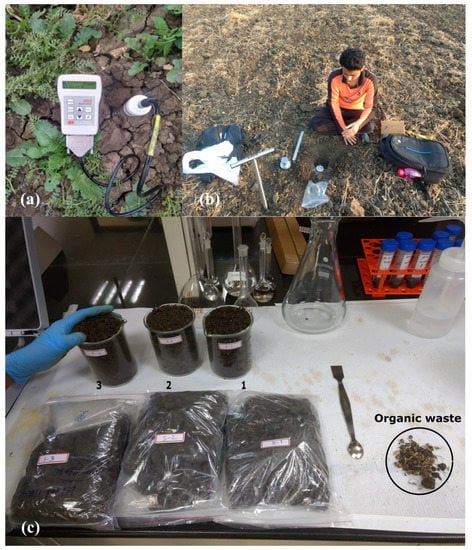 To conduct measurements, we overlay a square grid of on our study area [59]. We then randomly select few grids to measure the soil moisture. At the centre of each grid, we measured the soil moisture by inserting the metal rod of the theta probe at 5 cm below the ground surface and record the soil moisture value () in the data logger and acquired their locations using a Garmin-64S handheld GPS (Figure 3a). We repeated this procedure at least in 8 to 10 different locations within the grid and finally averaged them to get soil moisture (Figure 1). Simultaneously at each location, we have collected about 100 g of soil samples at 5 cm below the ground surface using tubular samplers (Figure 3b). We used these samples to measure soil moisture by oven drying method (Figure 3c). At each of the measurement location, we have also taken observations on land use, soil type, vegetation height and weather parameters (temperature, precipitation, etc.). Table 2 reports the detailed characteristics and location of our sampling sites.