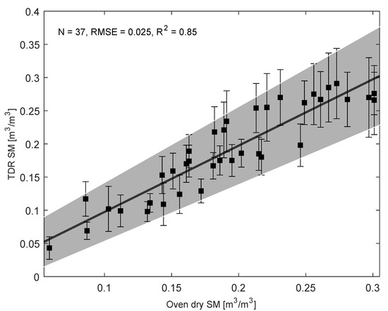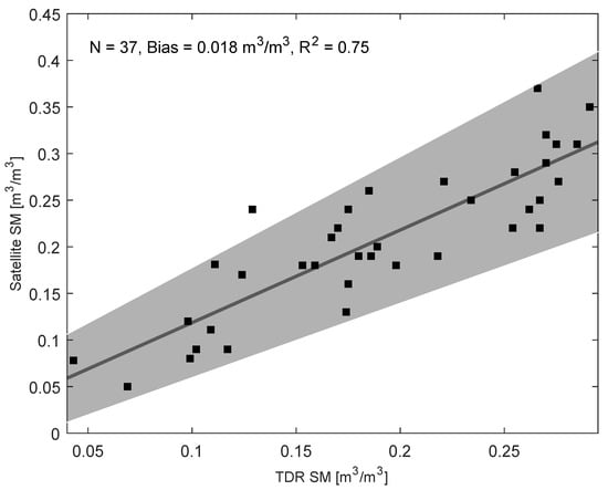 Regression curve between satellite derived and in-situ (TDR) measured soil moisture. Shaded gray region is the 95% confidence level of the regression curve.