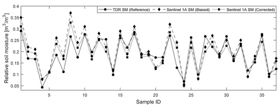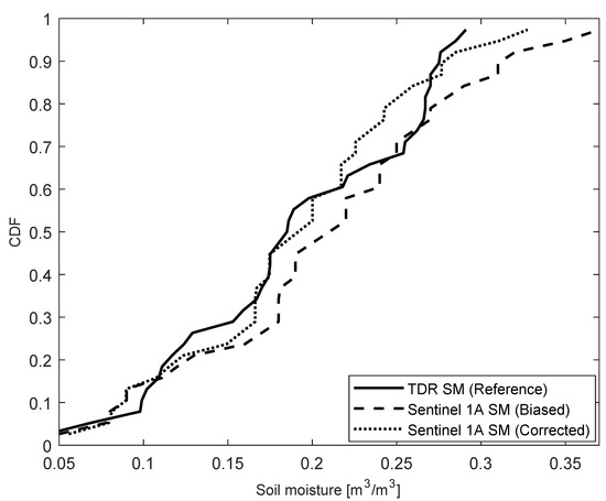 To overcome the systematic errors (instrument calibration and model error), we performed a bias correction by applying the CDF matching approach [68]. This is one of the widely used statistical methods to minimise the bias in satellite-derived soil moisture [69,70,71]. In principle, we adjusted the satellite-derived soil moisture according to the CDF of in-situ (TDR) soil moisture to minimise their difference (Figure 7).