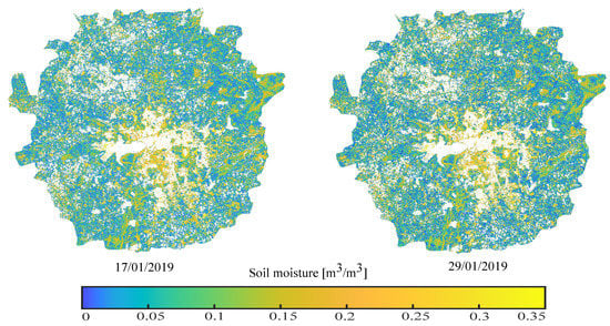Applying the CDF correction on our data, biases in the soil moisture derived from Sentinel-1A has reduced from 0.02 m/m to 0.001 m/m. Finally, we used the bias corrected values to generate soil moisture maps for 17 and 29 January 2019 (Figure 8) of the study area.