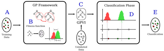 Genetic-Programming-based vegetation indices (GPVI) learning process and posterior classification framework for pixelwise discrimination. The labeled training set is represented by the set defined by part “A”. This ground truth is then used in the GP-based index discovery process in part “B”—see Section 3.1 and Section 3.2. Classification is performed based on the best GP individual (GPVI) found—part “C”. This individual is used to define a score for unlabeled samples and to define the index distributions per class. Finally, unlabeled samples are assigned to the class whose distribution is the closest—part “E”.