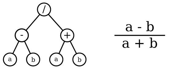 A typical representation of a GP individual relies on the use of a tree data structure, where leaf nodes (also known as terminals) represent operands and internal nodes encode functions, usually mathematical operators used to combine terminals. Figure 2 illustrates a typical GP tree representation, which encodes the function , where a and b represent two terminals (variables or constants) and +, −, and ÷ are the internal nodes.