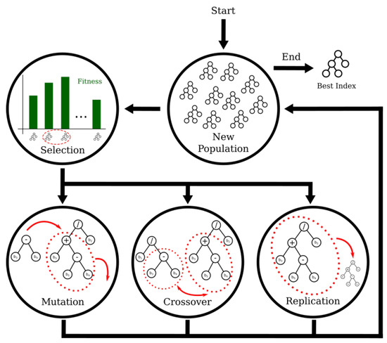 The GP framework starts with a randomly generated population of indices (e.g., ) that evolve as described above.