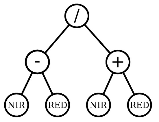 In our formulation, the spectral indices are computationally represented as a GP tree whose leaves are associated with RSI bands and the internal nodes, arithmetic operations. Figure 4 illustrates a GP individual, encoding the equation used to compute the Normalized Difference Vegetation Index (NDVI), defined in Equation (2).