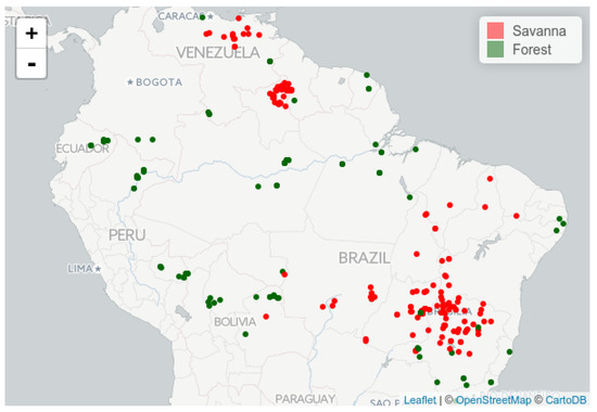 The selected study sites are distributed across the region, comprising South American tropical savannas and forests (Figure 5). These locations correspond to 250 m × 250 m areas with the centroids imported from a subset of the inventory data used by Dantas et al. [38]. Each of these points is visually assessed using Google Earth (GE) images from 2016, superimposed with MODIS grid cells of the same size while using Series Views [39]. The geographical coordinates used as ground truth are defined in terms of whether the MODIS pixel at which the points fall into are completely filled with the vegetation type consistent with the corresponding labeled biome (i.e., savanna or forest) and vegetation types, as determined during the field work campaigns. Pixels that are not entirely filled with the corresponding biome type (e.g., due to deforestation and conversion to other land uses) are either replaced by a neighboring pixel fulfilling these criteria or discarded (when a nearby suitable pixel could not be found).