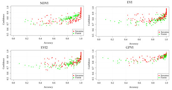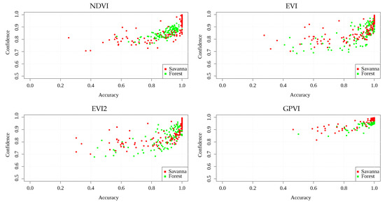 An additional experiment tests the confidence of the classification of the spectral indices. For this, we took the one-band pixel values, yielded by each spectral index, for all of the locations, trained a Logistic Regression classification algorithm with them [46] ([Ch. 4]), and used its predicted class probability given a data point as a confidence score, since the class that is assigned to the areas depends on whether this value is under or over . Thus, scores that are close to this value are more likely to be classified incorrectly, since the algorithm is totally uncertain of the class that it assigns to the sample. Figure 6 and Figure 7 show scatterplots of mean accuracy vs. mean confidence score obtained in each area, for Landsat and MODIS, respectively. It can be seen that GPVI presented, on average, higher confidence values than the baselines, which means less confusion at classification time. The fact that savannas and forest can transit into each other’s states [38], can explain those areas that, in general, obtained low confidence and low accuracy, since a transitional location presents features of both biomes, leading to a higher confusion in the classification algorithm. Those areas presenting low accuracy and high confidence in various experiments could also result from mislabeled samples.