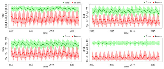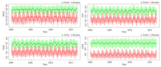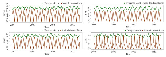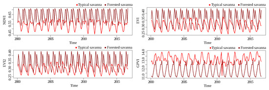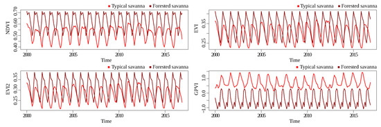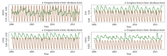 The discussion about the results presented in Section 4 is guided by the research questions defined in Section 1. The performance of GPVI on the non-temporal-pixelwise forest/savanna classification problem (Q1) show a clear superiority of GPVI over NDVI, EVI, and EVI2. This suggests that there exist complex interactions between the bands that characterize the class of a sample, regardless of its behavior through time. In the baselines, savannas sometimes took high values that could be interpreted by the classification routine as forests, and vice versa (Figure 8 and Figure 9). Thus, it is not possible to point out one area in a specific timestamp, measure its index, and conclude its class. For this reason, the traditional classification benchmark generally involves temporal information.