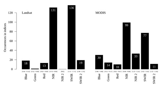 The typical savanna/forested savanna problem presented no agreement between the sensors (Figure 16). For example, the SWIR band is the most frequent for Landsat and the least frequent for MODIS, and the Red band, the most frequent for MODIS, is not so frequent for Landsat. This was also the most difficult pair of classes to discriminate in previous analyses.