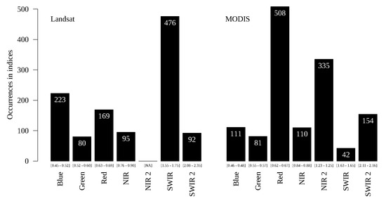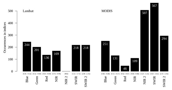 Figure 14, Figure 15 and Figure 16 show the number of occurrences of the bands with both sensors for, respectively, the forest/savanna, evergreen forest/semi-deciduous forest, and typical savanna/forested savanna classification problems.