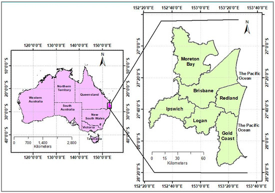 The local government area (LGA) of Brisbane and its surrounding LGAs covering an area of about 8556 km2 are chosen as the case study area in order to determine the impacts of anthropogenic activities on climate change. The study area comprises LGAs of Brisbane, Gold Coast, Moreton Bay, Redland, Logan, and Ipswich (Figure 1). The reasons that motivate us to select this region as the testbed are as follows: (a) the selected LGAs are located in the state of Queensland, where the state was subjected to nearly 60% of the nation’s land clearing over the last four decades (Steffen & Dean, 2018); (b) Queensland has been generating about 80% of the nation’s land use emissions (Steffen & Dean, 2018), which has substantial impacts on local climate change; (c) the selected LGAs are the most urbanized part of the state [37]; (d) Brisbane ranks as the most sprawling city in Australia [38,39]; (e) while Brisbane’s urban areas only accommodate 6% of the national population [40], its low-density urban expansion to nearby peri-urban areas places a great risk on the ecosystem services [41], and; (f) Brisbane is claimed to be one of the most sustainable and smart cities in Australia [42,43,44].