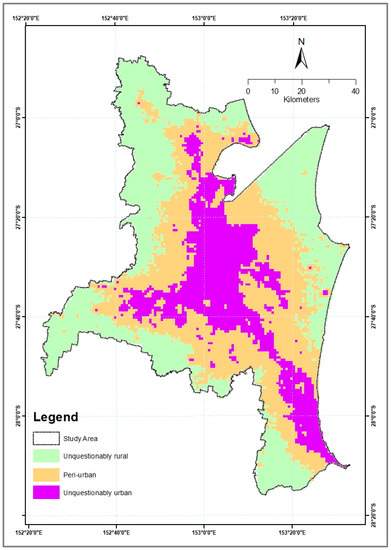 In order to determine the spatial distribution of GHG emissions within different urban growth land use areas, this paper adopts Mortoja et al.’s [23] study approach to demarcate unquestionably urban, peri-urban, and rural areas. They applied fuzzy logic on night-time light (NTL) data to demarcate these urban growth areas. This study applied their methodological approach to demarcate different urban growth areas for the year 2019 by using NTL data of 2019 (Figure 2). Later, this study estimated GHG emissions within the demarcated urban growth areas between 1989 and 2019. While estimating per capita GHG emissions for each LULC transition between 1989 and 2019, the study took the average value of per capita GHG emissions of the three decades.