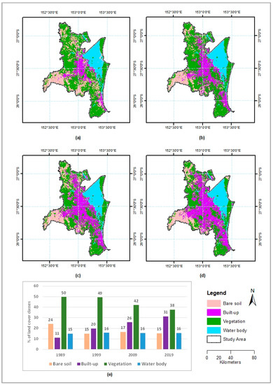 (a) Classified image of 1989; (b) Classified image of 1999; (c) Classified image of 2009; (d) Classified image of 2019; (e) % of changes in LULC between 1989, 1999, 2009 and 2019.