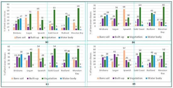 In terms of built-up areas growth within LGAs, Logan experienced the highest growth of 35% followed by Gold Coast (27%), and Moreton Bay (23%) between 1989 and 2019 (Figure 4). Within this 30-year period, Logan and Moreton Bay both also encountered the highest loss in vegetation (16%) followed by Ipswich (14%) and Gold Coast (13%). Again, in terms of bare soil, Logan experienced the most by 19%. Subsequently, throughout the 30-year period, Logan, Gold Coast and Moreton Bay experienced higher growth than Brisbane.