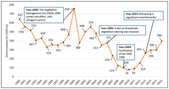 Besides, land clearing policy exerts significant climate change implications [31,32]. Along with the significant losses in ESV, about 10% of Australia’s net GHG emissions are stemmed from LULC-related activities [33], and the country currently is vulnerable to climate change impacts, with this vulnerability becoming intolerable by the year 2050 [34]. Despite this, the impacts of climate change—recently the term ‘climate emergency’ is being used instead—on Australia’s ecosystem services still are unidentified [35,36].