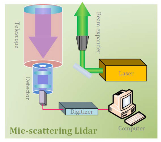 The height up to which sensible heat is transported is denoted by the PBLH. Since passive scalars are accumulated in the PBL and, therefore, a large gradient of aerosol concentration occurs at the inversion capping the PBL, this means that this gradient is also suited for defining the top of the PBL. Owing to the existence of inversion layer, a large number of aerosol particles are bound below the inversion layer, while in the free atmosphere above the inversion layer, the concentration of aerosol particles is sparse. The lidar echo signal intensity is directly related to the aerosol concentration at certain altitude. When the laser beam passes through the boundary between the PBL and the free atmosphere, it will be severely attenuated. Therefore, the abrupt change of the echo signal intensity can be used to determine the PBLH. A Mie-scattering lidar was employed for this study and its sketch is shown in Figure 1, which mainly includes the laser emission component, the telescope receiving component, the photoelectric conversion component, as well as the data acquisition and processing component [30,31]. A Mie-scattering lidar emits high-energy laser pulses to the atmosphere, which then collects the light signals from aerosol backscattering with telescope, and calculates the aerosol parameters according to a certain inversion model. The lidar signal can be expressed as
