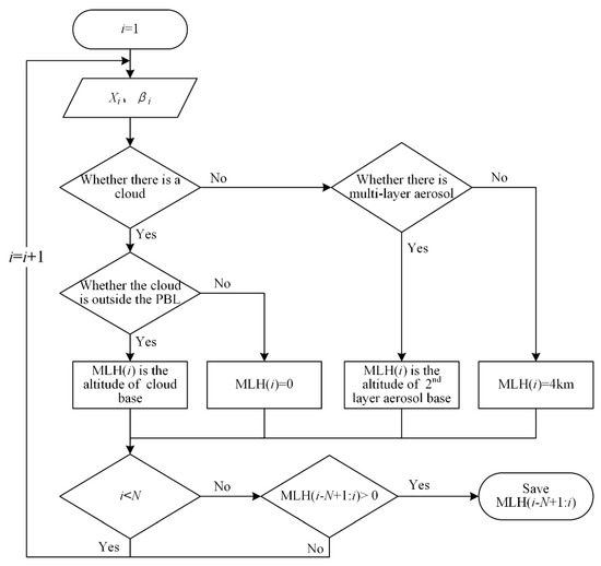 Finally, it is judged whether the MLH of the initial backscatter signal profiles is effective. In this study, the temporal resolution of the signal is 30 s and the PBL is considered rather constant within 3 min, so that the MLH of the first six single profiles is calculated (N = 6 in Figure 2). Furthermore, N can choose different values on the basis of the characteristics of the PBLH at different locations. However, it must be ensured that the PBLH does not change much in the selected period. If there is 0 among these six MLH, it means that there is cloud within PBL. In this case, PBLH cannot be determined and initialization of MLH is not successful. The algorithm is set to calculate the MLH of the next signal profile, until six consecutive effective MLH is obtained.