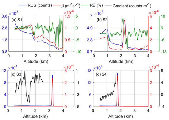 First of all, it is of great significance to identify the elevated aerosols or clouds accurately on the signal profile. In the single layer case, the backscatter signal decreases linearly with height within the PBL. However, when an aloft layer of aerosol or cloud in general is presented, a strong positive gradient can be observed on the single profile. The backscatter coefficient represents the scattering ability of aerosol to light wave, and the positive gradient changes more obviously on the backscatter coefficient profile [47]. Based on this characteristic, separated aerosol layers can be identified by looking for a strong positive gradient on the backscatter coefficient profile. The analyses based on many aloft aerosol layer cases prove that the relative increase () in the backscatter coefficient profile of at least 10% is required, which is applicable over 532 nm lidar. Therefore, in this study, the empirical threshold of aloft aerosol layers is set when the RE is greater than 10%. Sometimes, very thin clouds near the surface might be interpreted as suspended aerosol layers, which do not have a major impact on the algorithm. Unlike aerosol, the backscatter coefficient of cloud is much larger [48], and can easily be identified by setting a threshold. We define the cloud base in much the same way as other previous studies [49,50,51]. A statistical result relying on many cloudy cases proves that the threshold of backscatter coefficient is more than m−1sr−1, which can accurately identify the cloud layer. Due to the deviation of the backscattering coefficient, it is impossible to completely use these two thresholds in any 532 nm lidar. However, these two thresholds are related to the wavelength and aerosol of lidar, but not to the signal value. Therefore, they can be used as reference values for other stations with 532 nm lidar.