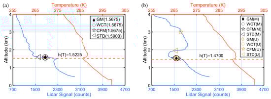 The normalized RCS of the first case is as shown in Figure 9. The evolution of the double layer aerosol has been observed during 06:00–18:00 LT on 23 August 2017. The height of the near-surface aerosol layer in this period is about 1 km, and there is a distinct lofted aerosol layer between 2 km and 4 km AGL. For PBLH retrieval, without MLHI-RR, the CFM captures the height close to the upper edge of the elevated aerosol layer, the STD sometimes distinguishes the base of the aloft aerosol layer as PBLH, and the GM and WCT occasionally make mistakes as well (Figure 9a). The CFM has problems on account of no clear signal step function during this period. After initializing MLH and setting RR (Figure 9b), compared with the PBLH determined by temperature-gradient method (orange squares), the PBLH is then successfully determined by four lidar methods. The GM and WCT methods work best under these complex conditions of aerosol layers. The outcome of the comparison results state clearly that the new technology can eliminate the effect of lofted aerosol layers. Furthermore, the PBLH identified by the four lidar methods is more consistent using the MLHI-RR technique.