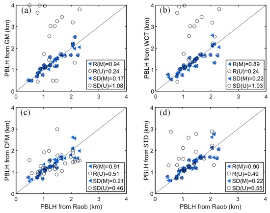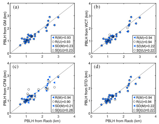In total, the determined PBLH for 32 single-layer cases and 44 multi-layer cases from three sites (showed in Table 1 in Section 2.3) are compared and analyzed. The number of cases was limited, due to the lack of lidar and radiosonde data during the period, as well as the removal of some data with observed errors. As shown in Figure 6, in single aerosol layer cases, the PBLH determined by lidar measurement (vertical coordinate) and radiosonde (horizontal coordinate) are compared and found to be highly consistent. The PBLHs retrieved by four lidar methods have a correlation coefficient above 0.9 with that determined by the radiosonde. The correlation coefficients and standard deviations of GM, WCT and STD are the same with MLHI-RR (blue triangles) and without it (black circles), while the PBLH determined by CFM with MLHI-RR is slightly more accurate. The results illustrate that the lidar can accurately identify the PBLH for the case of a single aerosol layer.