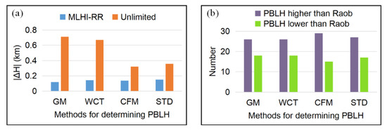 The statistic of PBLH derived from four lidar methods with MLHI-RR and without limiter in the multi-layer conditions is compared in Figure 8a, where |ΔH| is the difference of PBLH between lidar method and radiosonde. Without any limiter, the PBLH inverted by four lidar methods has a great deviation with the altitude differences all of which are higher than 0.3 km, especially for GM (0.711 km) and WCT (0.670 km). With MLHI-RR, the altitude differences are all less than 0.2 km. Nonetheless, our comparison reaches a conclusion similar to Hennemuth and Lammert [54], which found that the PBLH based on radiosonde and lidar data deviates between ±0.2 km. The number of cases that the PBLH determined by lidar method is higher or lower than that measured by radiosonde, as summarized in Figure 8b. The PBLH from lidar tends to be somewhat higher than that from radiosonde, mainly because the lidar detects the immediate top of the inversion layer, while the temperature-gradient determines the PBLH at about the middle to the top of the inversion layer.