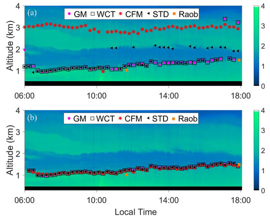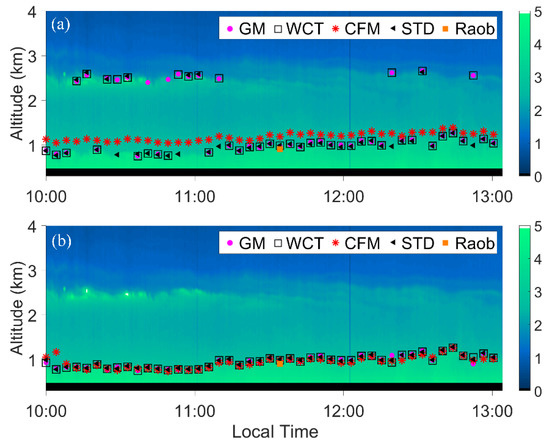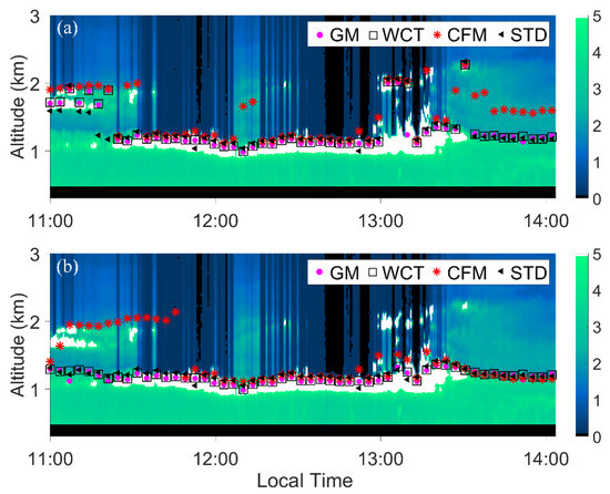 In a clear day and small wind, the misty elevated aerosols frequently appear, with the result being that the lidar measurements of PBLH may be seriously influenced. Figure 10 shows the PBL evolution in terms of normalized RCS observed with lidar on 19 August 2017. From 10:00–13:00 LT, misty elevated aerosols above the PBL complicate the retrieval of the PBLH. It is clear to see the top of the lifted aerosol layer during 10:00–11:00 LT. Gradually, the lifted aerosol layer becomes unapparent. The results regarding the retrieval of PBL top with the four lidar methods are shown in Figure 10. Without any limitation, it can be seen in Figure 10a that none of the four lidar methods can successfully identify true PBLH over time. The CFM captures the altitude higher than the PBLH affected by the elevated aerosols. Moreover, the GM, WCT and STD are easily affected by the elevated aerosols when the signal negative gradient at the lofted layer top is stronger than that at the top of the near surface aerosol layer. After using the MLHI-RR, four lidar methods are able to detect the PBLH accurately (Figure 9b). The comparison results prove that the new technology put forward in this paper can eliminate the influence of the misty elevated aerosols.