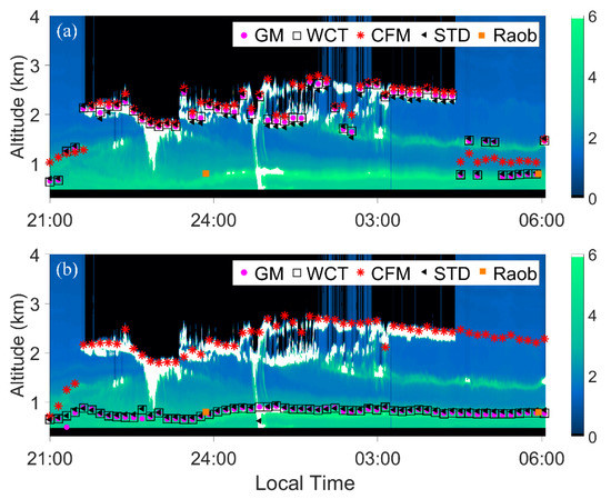 Figure 12 shows another case, 25–26 August 2017, which is a cloudy day with lofted aerosol layer between 02:00 and 06:00 LT. There is a thin cloud layer (blank region) above 2 km AGL from 21:30 to 04:30. The PBLH determined by temperature-gradient method at 23:30 LT and 05:30 LT are 0.7950 km and 0.7875 km. Without any limitation, four lidar methods are all wrong when capturing the edge of the cloud or the elevated aerosol layer (Figure 12a). As shown in Figure 12b, the addition of the MLHI-RR improves the results, causing the resulting PBLH of the GM, WCT and STD to conform the more typical evolution of the PBLH, and to be closer to the PBLH estimated by the temperature-gradient method. Although there are clouds and elevated aerosols simultaneously, the technology proposed in this paper can effectively eliminate the effect. However, the CFM performs poorly, as it regards the cloudy boundary as PBLH. Combined with the results and analysis in Figure 11, it can be seen that CFM is not suitable for retrieving the PBLH under the situation with cloud.