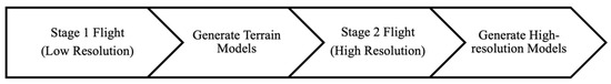 Figure 2 depicts the developed procedure for generating high-resolution maps for an open-pit mine. There are two stages of flights in this process. First, an area mapping flight is conducted at the highest permitted altitude by designing a grid mission and using ground control points (GCPs). Then, photogrammetry is used to create the updated terrain model of the mine. Since the geometry of benches and walls constantly change in an open-pit mine, this stage needs to be repeated periodically. Second, the surface terrain obtained in the first stage is used as an input to fly the drone precisely at a required elevation above an area of interest to generate high-resolution models of that area. In both flight stages, each waypoint is defined based on the forward and side overlap required between images. Unlike the constant flight altitude in Stage 1, elevations of waypoints in Stage 2 are set at a constant distance above the mine terrain model, which is derived from Stage 1. This distance is determined based on the required ground resolution and camera specifications. Another difference between the two flights is that Stage 1 always follows a parallel path, while Stage 2 follows an optimized path that will be explained later in the paper.