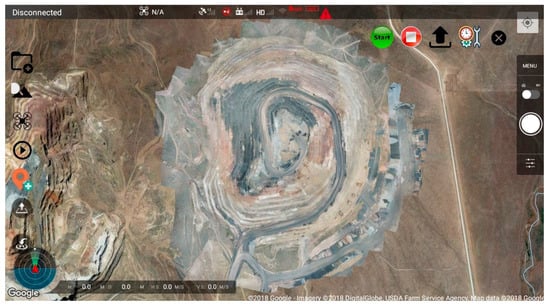 Figure 4 depicts the flight planning interface of the designed mobile application. It can import 3D terrain models generated using photogrammetry. As shown in Figure 4, the most up-to-date 3D model of the mine has been overlaid as a reference for the user on Google Maps, which initially did not have a trace of on-going mining operations. Subsequently, the user can plan and edit UAV mapping missions based on the imported terrain. Once flight parameters are input by the user, the application uploads the path to the drone’s flight controller, which will execute the mission and bring the drone back to its initial launch position. Once the drone lands, the mobile application automatically downloads captured images and uploads them to the project server where they will be processed for the next stages of the project.