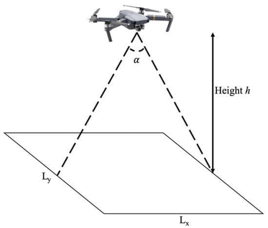 The size (, ,) of the ground image taken by the UAV flying at height h above the ground depends on h and the size of the image sensor, as shown in Figure 5 [13,14]. It can be computed as follows: