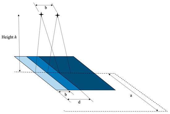 From Equation (1), it can be concluded that the size of the image on the ground is directly proportional to the altitude of the UAV above the ground. Another important parameter is the proportion of overlapping between images along the length and width of the area. The industry-wide recommendation is to have 85% forward (length) overlap and 70% side (width) overlap [26]. The distance between two overlapping images along the length and the width of an area of interest (Figure 6) can be determined as: