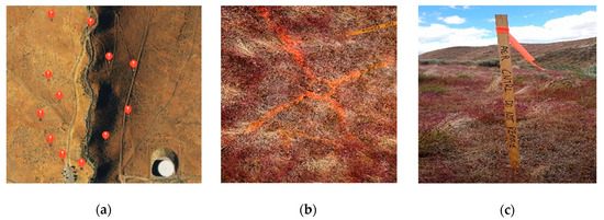 (a) Ground control points (GCPs) at Keystone Trailhead; (b) X-mark GCP; (c) Survey stake.