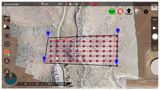 The developed application has been validated by conducting a case study at the East Keystone Trail Head near Reno, Nevada. The objective of this experiment is to validate the ability of the software to generate high-resolution terrain maps of the area by following the terrain at a constant altitude. The East Keystone trail is a suitable site for this experiment because it has a hilly terrain and is sparsely populated. GCPs were laid out over the approximately 0.09 km2 area, as shown in Figure 7a to minimize errors in generated 3D models. X-marks are made with survey-grade spray paint that has a bright color like orange, as shown in Figure 7b. The size of each X-mark is 1 m × 1 m. A wooden peg was installed at the center of the X-mark to be used as a survey point. In order to easily spot GCPs, survey stakes with ribbons, as shown in Figure 7c, were placed near them. An integrated global navigation satellite system (GNSS) was used for surveying. This unit is comprised of a Trimble R8 as the receiver and a Trimble TSC3 as the data collector.