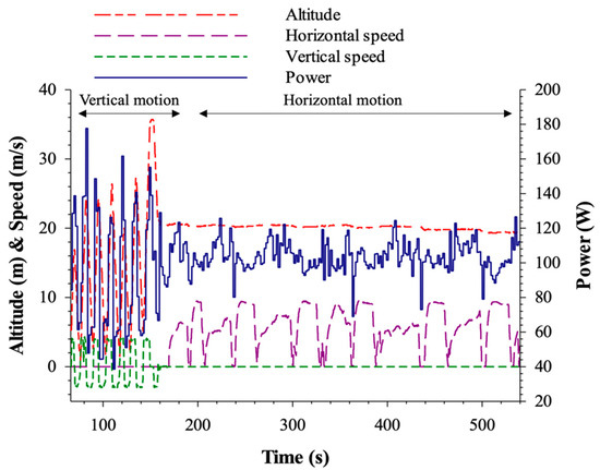 In this project, a statistical approach was used for deriving the energy consumption model for the DJI Mavic Pro. In a UAV, powering motors to lift the UAV’s body consumes a significant portion of total available energy. The rest is consumed in controlling the UAV’s motion in different directions. An experimental analysis was performed to study on-board battery power consumption during the drone’s movements in different directions while encountering varying wind speeds. A drone’s movements can be categorized as hovering, horizontal, and vertical motion. Each drone flight is a combination of these three motion types. To measure the rate of power consumption during these motions, multiple experiments were conducted. In each experiment, the drone was programmed to ascend and descent repeatedly at its maximum speed in a vertical direction. Then, it is moved horizontally at maximum speed without altering its altitude. DJI Mavic Pro was used as a test platform for these experiments. The UAV’s speed relative to the ground in vertical and horizontal directions, battery power, and barometers readings are recorded for each experiment from telemetry data. Figure 11 depicts recorded data from one of the above experiments for the DJI Mavic Pro test drone. Barometer readings show the drone’s altitude above the ground. Accelerations in both vertical and horizontal directions were also calculated from time series data. During vertical movements, the drone deviated slightly from a straight path, due to errors in GPS modules. Similarly, during horizontal movements, the UAV was not moving at an exact constant altitude, due to barometer errors. However, the average of these deviations was less than 0.1 m, which is considered negligible.