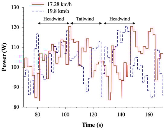 It can be observed in Figure 12 that the DJI Mavic Pro’s power consumption increases when it is flying in the direction opposite to the wind (i.e., with a headwind) and decreases when it is flying in the same direction as the wind (i.e., with a tailwind); however, the relationship is not linear. Aerodynamics confirm that flying with a headwind decreases power consumption, due to an increase in relative flow over propellers, and hence, an increase in a translational lift [40]. On the other hand, at higher wind speeds, aerodynamic drag can outweigh translational lift [39]. During the experiments described above, when the drone was flying with a headwind at its maximum speed, more drag is created than translational lift resulting in more power consumption.