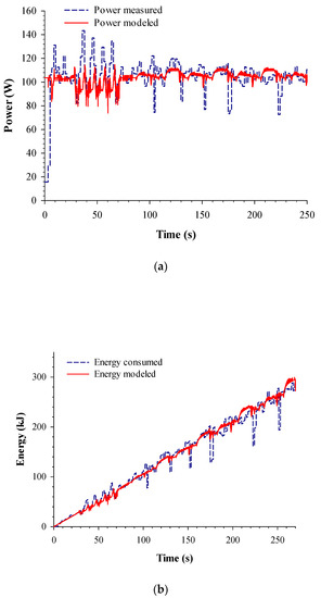 Measured and modeled (a) power and (b) energy consumption for the DJI Mavic UAV.