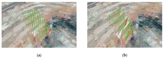 A case study was developed by deriving centerlines of benches for an open-pit mine in Nevada. Mine bench centerlines were manually extracted from the mine’s point cloud using PhotoScan software. These centerlines were then elevated 36.75 m above the ground as the required image resolution is 1.27 cm. To ensure the minimum forward overlap of 80% between successive images along the bench, the maximum distance between two consecutive points was restricted to 7.6 m (using Equations (1)–(5)). From these centerlines, two different regions (R1 and R2) were selected and optimized UAV flight paths for these regions were determined, as shown in Figure 15b and Figure 16b, using the designed GA in Matlab [43].