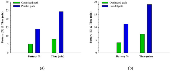 From Figure 17, it can be observed that battery percent and mission time for both regions are 50% less for the optimized path compared to the parallel path. Moreover, in the case of the optimized path, the UAV is programed to fly exactly over benches to image only the area of interest (horizontal bench surface in this case, with a final aim to monitor tension cracks in the next step of the research) saving both time and battery power. It can be seen that total battery power consumed in a particular UAV flight is directly proportional to flight time. This simulation study validates the proposed UAV flight path optimization algorithm by determining UAV paths for high-resolution imaging of an area that consume less battery power compared to a conventional parallel path.
