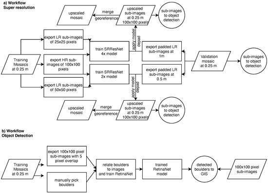 The following materials S1 to S4 are available online at https://www.mdpi.com/2072-4292/12/14/2284/s1, Figure S1: Manual identification of boulders at 0.125 m for the facies isolated boulders, small boulders and large boulders. Figure S2: Zipped georeferenced training mosaics, Figure S3: zipped georeferenced validation mosaics, Figure S4: Used training database with coordinates of boulders used for training of the object detection model in sqlite format. RetinaNet is available at github.com/fizyr/keras-retinanet, last accessed 20.04.2020. The implementation of SRResnet can be found at github.com/brade31919/SRGAN-tensorflow, last accessed 04.06.2020. The repository for the anchor optimization is available at github.com/martinzlocha/anchor-optimization, last accessed 06.05.2020. The gdal utilities are available at gdal.org, last accessed 14.04.2020. Scikit-image is available at scikit-image.org, last accessed 14.04.2020.