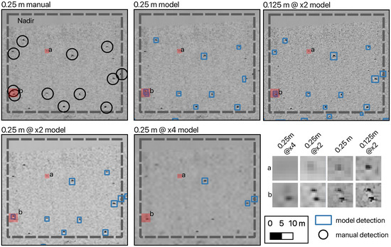 Instead, it is observed that the minimum bounding box size for the 0.125 m @ × 2, 0.25 m and 0.25 m @ × 2 mosaics correspond to ca. 4 × 4 to 6 × 6 pixels in the mosaics, with smaller objects not exceeding the score threshold of 0.3. This explains the six-fold increase of detected objects with bounding boxes smaller than 1.50 m on the 0.125 m @ × 2 mosaic. Increased pixel number correlate to an increased score, with over bounding boxes from 0 to 10 m. Therefore, upscaling allows smaller objects to achieve higher scores and significantly more smaller objects are recognized on the 0.125 m @ × 2 mosaic. As demonstrated by the high precision values of the 0.125 m @ × 2 mosaic, this does not cause an undue increase of false positive detections.
