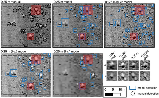 Figure 8 demonstrates the performance in an area including large boulders with distinct and extended shadows on glacial lag deposits. From west to east, the original image shows a gradual increase in backscatter, which is reproduced in images upscaled by a factor of 2 and 4. The manual count results in 32 boulders. The number of boulder recognized in the native mosaic by the model is 28 with an F score of 0.85. The model running on the 0.25 m @ × 2 mosaic finds 26 objects, while the number drops to 9 for the 0.25 m @ × 4 mosaic. The respective F scores are 0.75 and 0.44. For large boulders, the model counts 35 boulders on the 0.125 m @ × 2 mosaic, while 55 potential boulders could be identified manually at the increased resolution. Of these, 34 are also identified as boulders by the automatic classifications, while 21 manual interpretations are not confirmed by the model. The resulting F score for the upscaled models is 0.77.