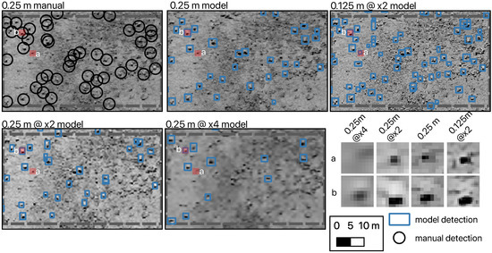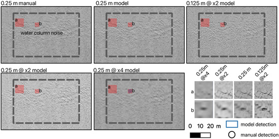 For larger bounding boxes, the score values of detected boulders reach a plateau (r reduces to −0.15 considering only bounding boxes above 5 m), as the increased amount of pixels no longer contribute to better scores. Figure 12 also demonstrates that above 5 m, an increasing distinction between objects with high and low scores exists. This explains that for large bounding boxes, roughly above the 80th percentile (Figure 12), no performance differences between the 0.125 m @ × 2, 0.25 m and 0.25 m @ × 2 mosaics are observed. Finally, it should be noted that the upscaling, beyond the native resolution of the dataset, to 0.125 m resolution also benefitted the manual determination of smaller boulders (e.g., Figure 9), indicating the human interpreter is still more efficient at detecting very small objects on the seafloor. However, with an increasing amount of recognized objects the manual detection becomes even more unfeasible over larger areas. For the 0.25 m @ × 4 mosaic, upscaling still increases performance above the 0.5 m resolution mosaic, but the performance for small objects altogether is poor, with the minimum detected object bounding box comprising 2.37 m. It can be assumed that fine boulders are not sufficiently imaged in the 1.0 m resolved LR mosaic, and cannot be restored by upscaling. Examples of fine boulders disappearing in the 0.25 m @ × 4 mosaics are displayed in Figure 7a and Figure 9a. In summary, upscaling by a factor of 2 causes a marked improvement in the detection of fine boulders, while no performance difference is observed for larger objects. However, the expected distribution of bounding box sizes, with a maximum at the smallest objects, is not achieved.