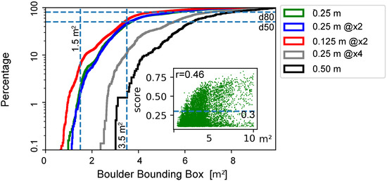 The expectation of an increasing number of small boulders is clearly not reflected in the bounding box distribution based on any of the considered mosaics (Figure 12). The decrease in small objects is not primarily related to anchor box parameters of the object detection framework. The smallest anchor box of 32 × 32 pixels corresponds at a standard threshold of areal overlap of 0.5 (not accounting for ratios setting) to a minimum object size of 23 × 23 pixels. Because sub-images of 25 m × 25 m were used as input images and were upscaled to 800 pixels height and width internally by RetinaNet, 23 × 23 pixels corresponds to a minimum area of ca. 0.5 m in the input images regardless of mosaic resolution. At a score threshold of 0.3, the smallest objects identified on the 0.125 m @ × 2 mosaic (0.53 m) correspond to the theoretical minimum and small object detection may have benefited from smaller anchor boxes. Detections based on all other mosaics are not affected.