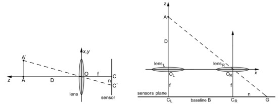 The contribution along the z axis is due to the assessment of the value of disparity and is the only component strictly inherent to the stereo system. In the right panel of Figure 1, the real point A placed on the optical axis of the left camera at a distance D from the optical center , has images in the left sensor center and in the point G on the right sensor (pinhole camera model). Point G is n pixels far from the right sensor center , so that n is just the disparity of the real point A in pixels units. Exploiting the similarity criteria, a location error along z () can be expressed in differential form as