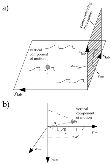 Figure 2 (upper panel) shows the reference frame linked to the cameras and the one linked to the laboratory (world reference frame), whose plane is the still water surface. Without loss of generality, it can be assumed that the plane contains the baseline in the direction. Let be the angle formed by with and the angle formed by with the plane (Figure 2, lower panel). The projection along of the three components , , and , with no regards to signs, gives