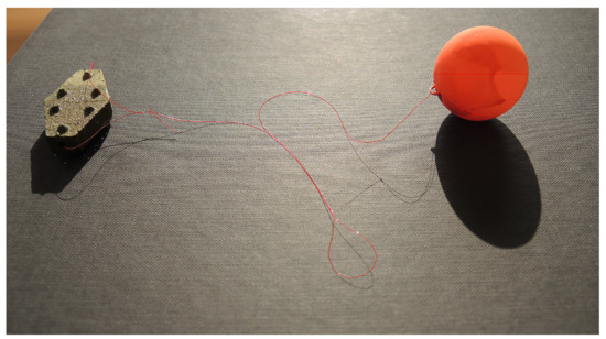 Table tennis plastic balls (diameter equal to 40 mm; weight equal to 2.4 g) have been used as markers. The spheres have been previously treated with a red color paint to improve the performance of the segmentation phase: both the color and the size of the markers have been chosen based on the results of a sensitivity analysis performed ad hoc. The painted markers have been equipped with a mooring system, similar to the wave-buoys mooring layout, made of a stiff plastic cord, and an anchor weight, i.e., a lead fishing weight (Figure 3).